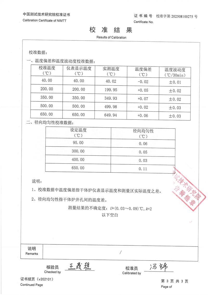 干體式溫度校準(zhǔn)器(40~650℃)校準(zhǔn)證書