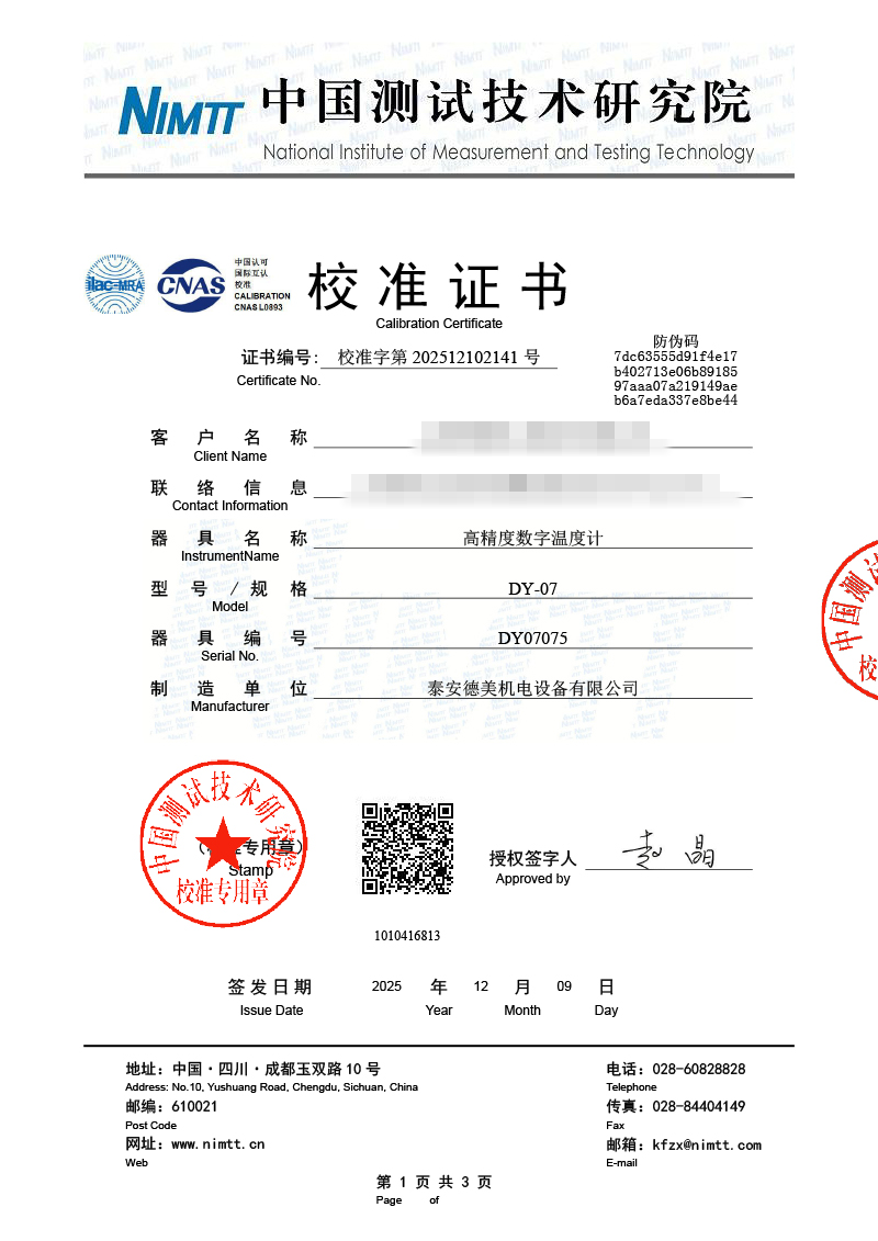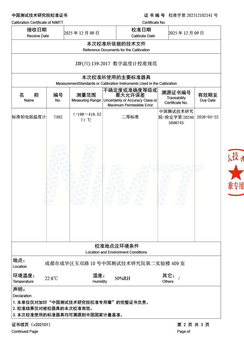 高精度數字溫度計校準證書 2025-12-11 本文被閱讀 1264 次