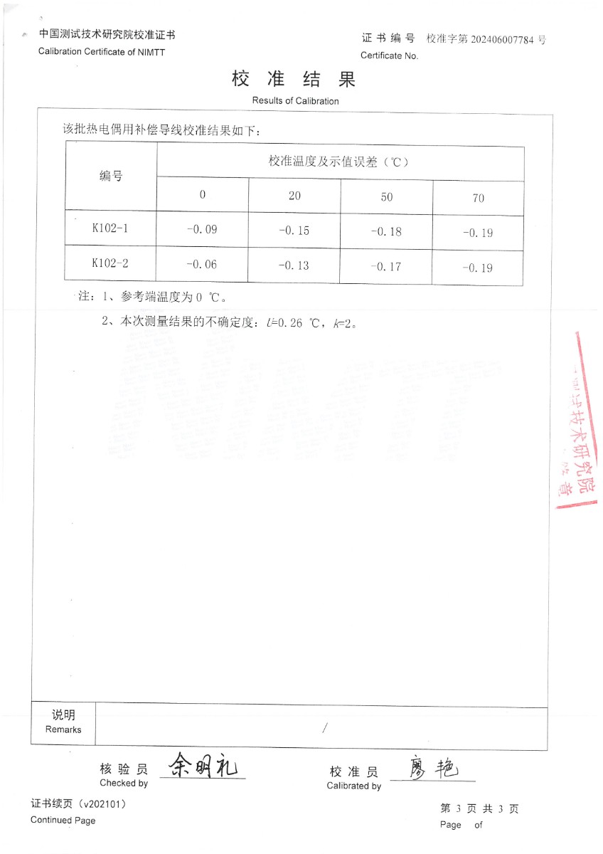 補(bǔ)償導(dǎo)線K分度校準(zhǔn)證書