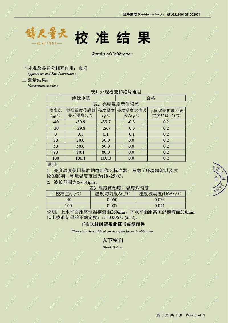 低溫液槽式黑體爐(-40-100℃)校準(zhǔn)證書