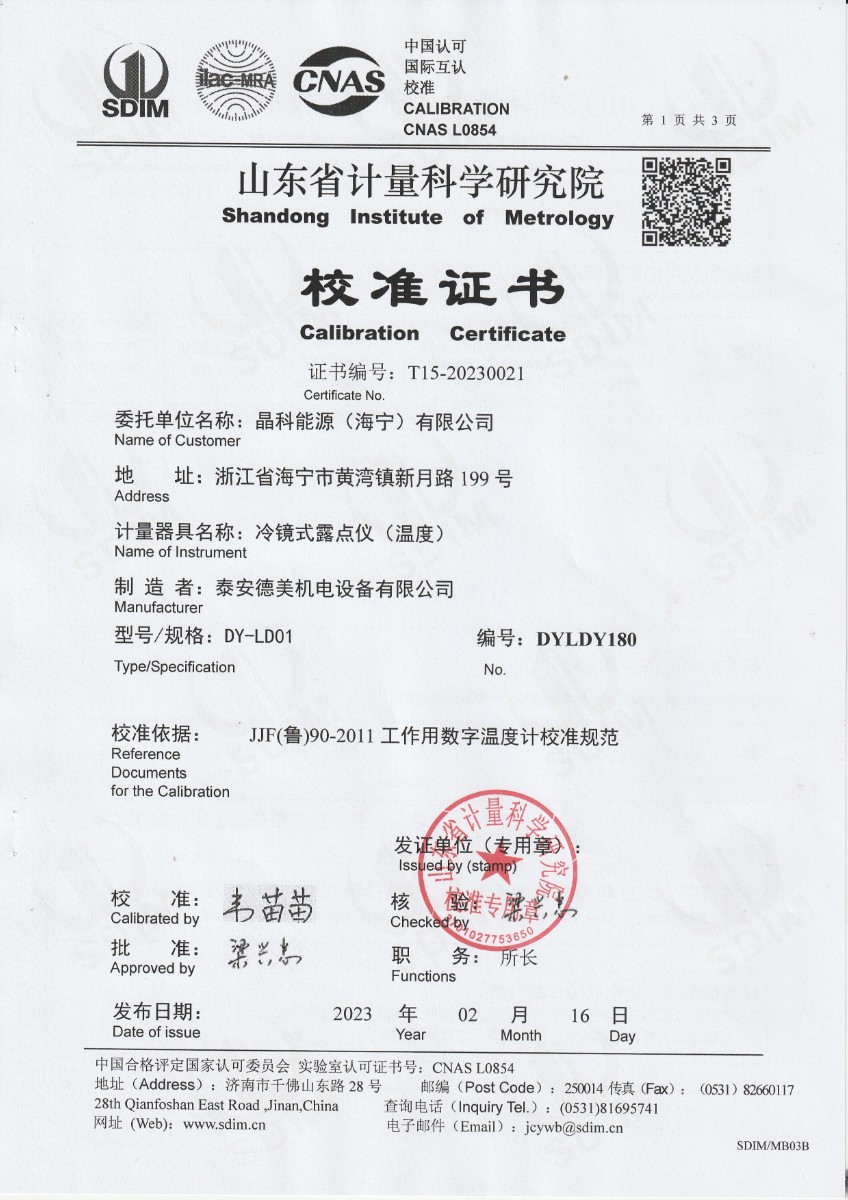 | 上一條:晶科能源(海寧)有限公司 冷鏡式露點(diǎn)儀 檢定證書 | 下一條:廉金屬熱電偶檢定爐-校準(zhǔn)證書 |